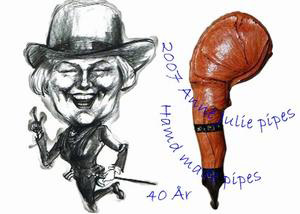 Poul Rasmussen在Hornemannsgade的店将要关门了。正好那天办完相关手续,Anne Julie在开车从Osterbro到她在Emdrup附近Copenhagen北部小公寓的路上,她遇到了她丈夫以前的学生。 他们在交谈中一遍又一遍地探讨着彼此感兴趣的东西――烟斗。此时,AnneJulie惊奇的发现自己在烟斗制作中的天赋。在此之前,她从未做过烟斗,按照她丈夫的说法,烟斗的制造仅仅是男人的工作。经过一番简单的准备,AnneJulie决定从最简单最基本的地方开始动工。她曾考虑过其中许多的困难,但她十分有信心能够使自己实现这个愿望。Anne Julie在KentMeltorns这里工作了很长时间,每天下午她都会去那家可以让她留下来制作烟斗的店铺。 |